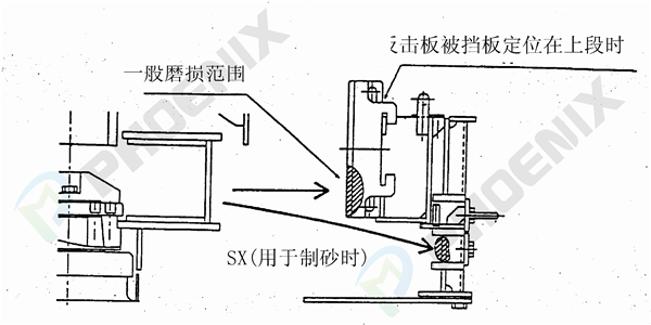 注:反击板可按照下列步骤对反击板进行向上/向下运动进行更换,见图二:反击板磨损图
